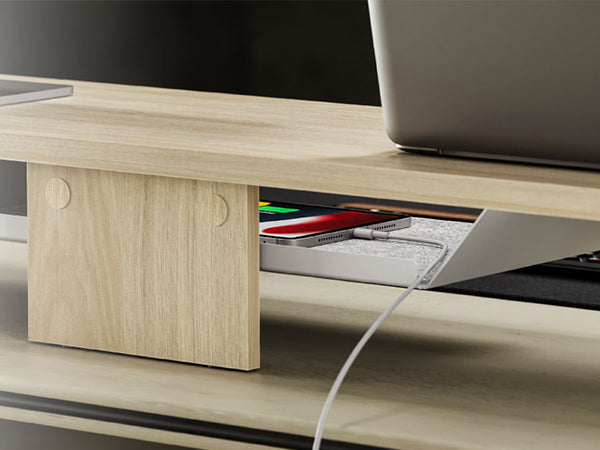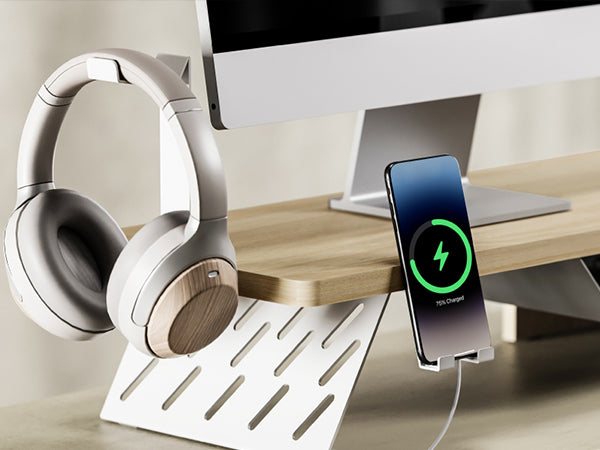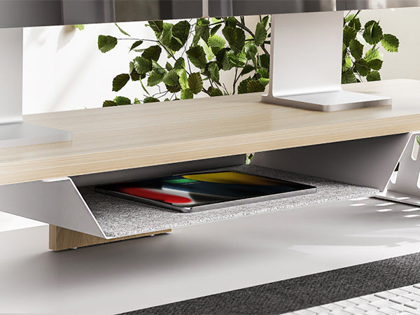 Core combines a dual monitor stand with an integratedphone holder and headphone hook—perfect for multi-device workflows. A second shelf (16.5" L × 2.1" H) provides extra storage for office essentials, helping you maintain a clean and efficient workspace.