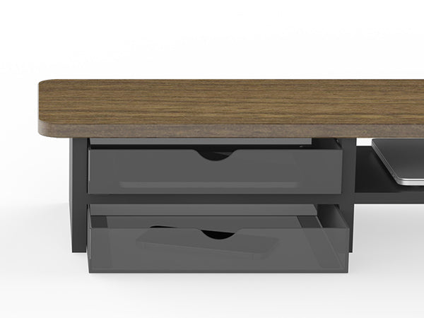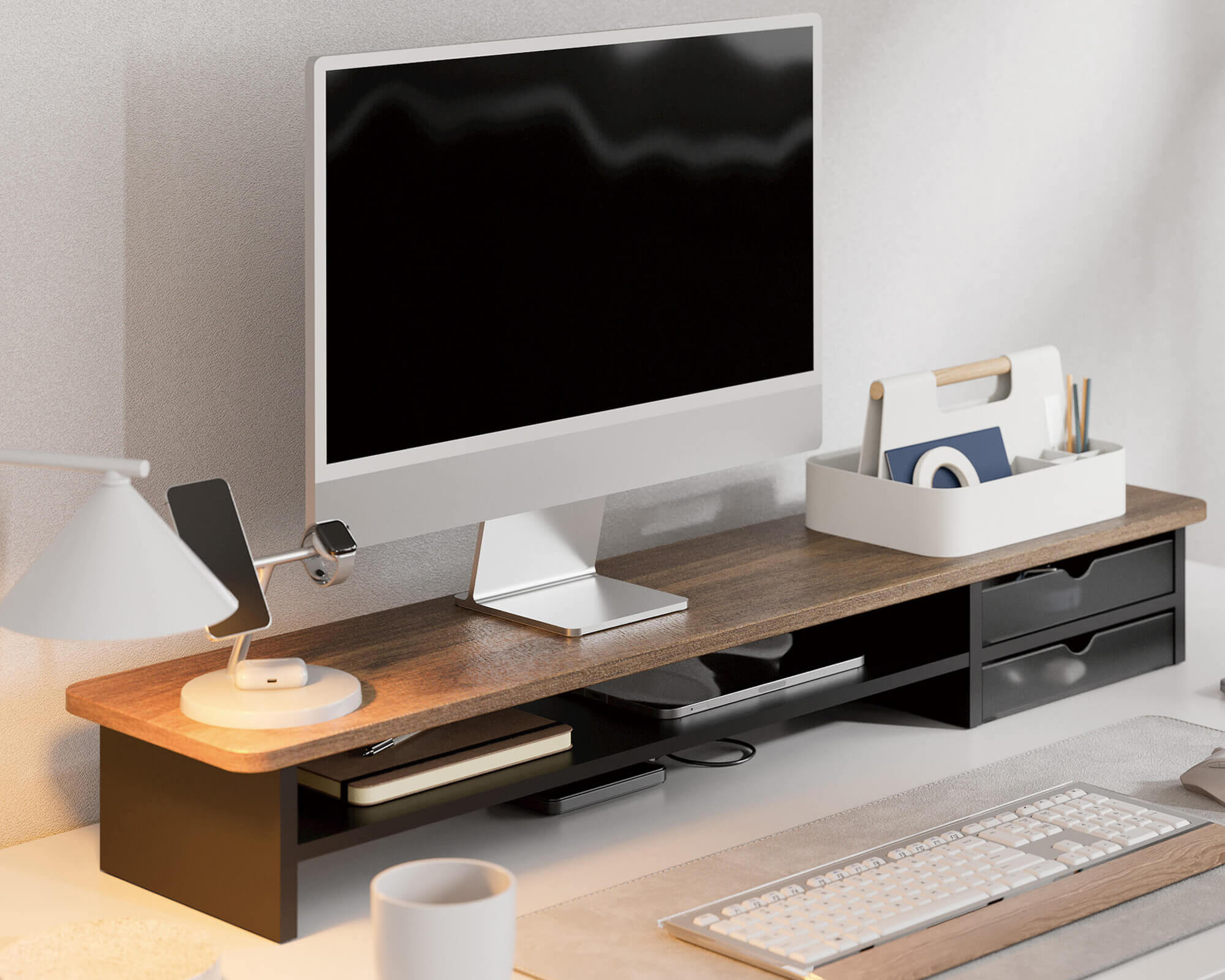 A spacious 42.5" desk shelf built for dual monitors. The 2-tier design, paired with frosted acrylic drawers, blends utility with artistry—keeping essentials organized while elevating your setup.