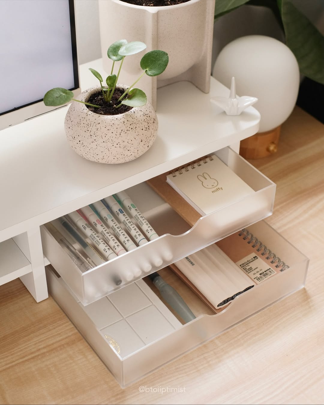 Spanning 42.5 inches, the Klimt 210 comfortably supports dual monitors. Its tiered design and frosted acrylic drawers keep essentials organized, blending warm textures with geometric tension to declutter your desk—and make room for beauty.
