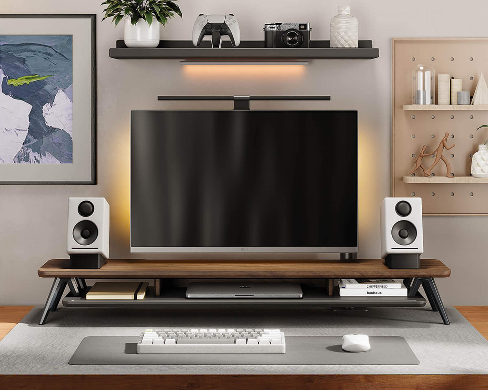 To maintain the FENGE Monitor Stand‘s appearance and durability, wipe it with a soft, slightly damp cloth and dry it right after. Avoid chemical cleaners or abrasives, and clean spills promptly to prevent damage.