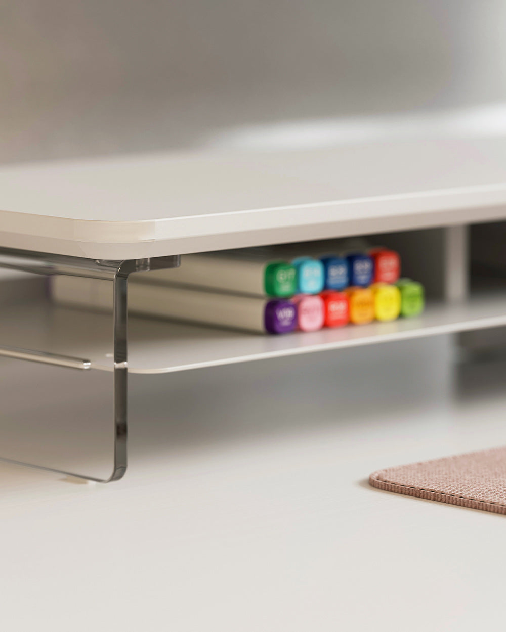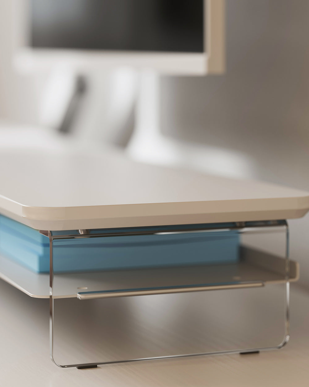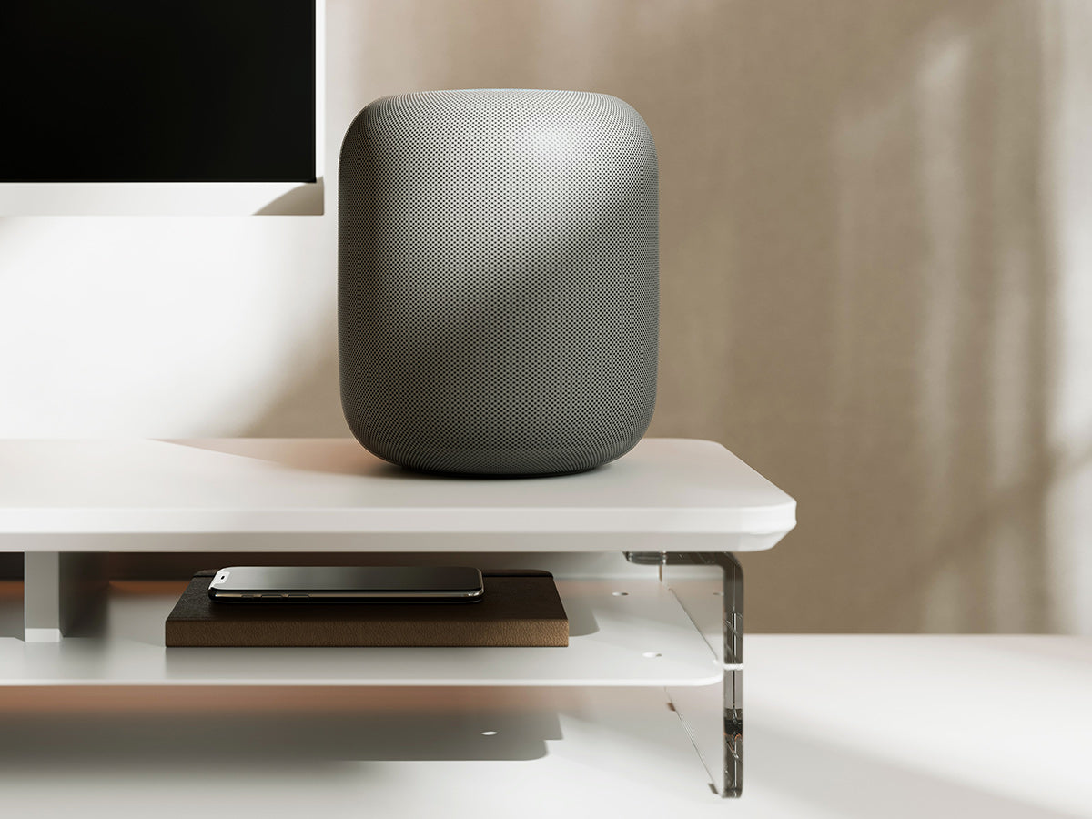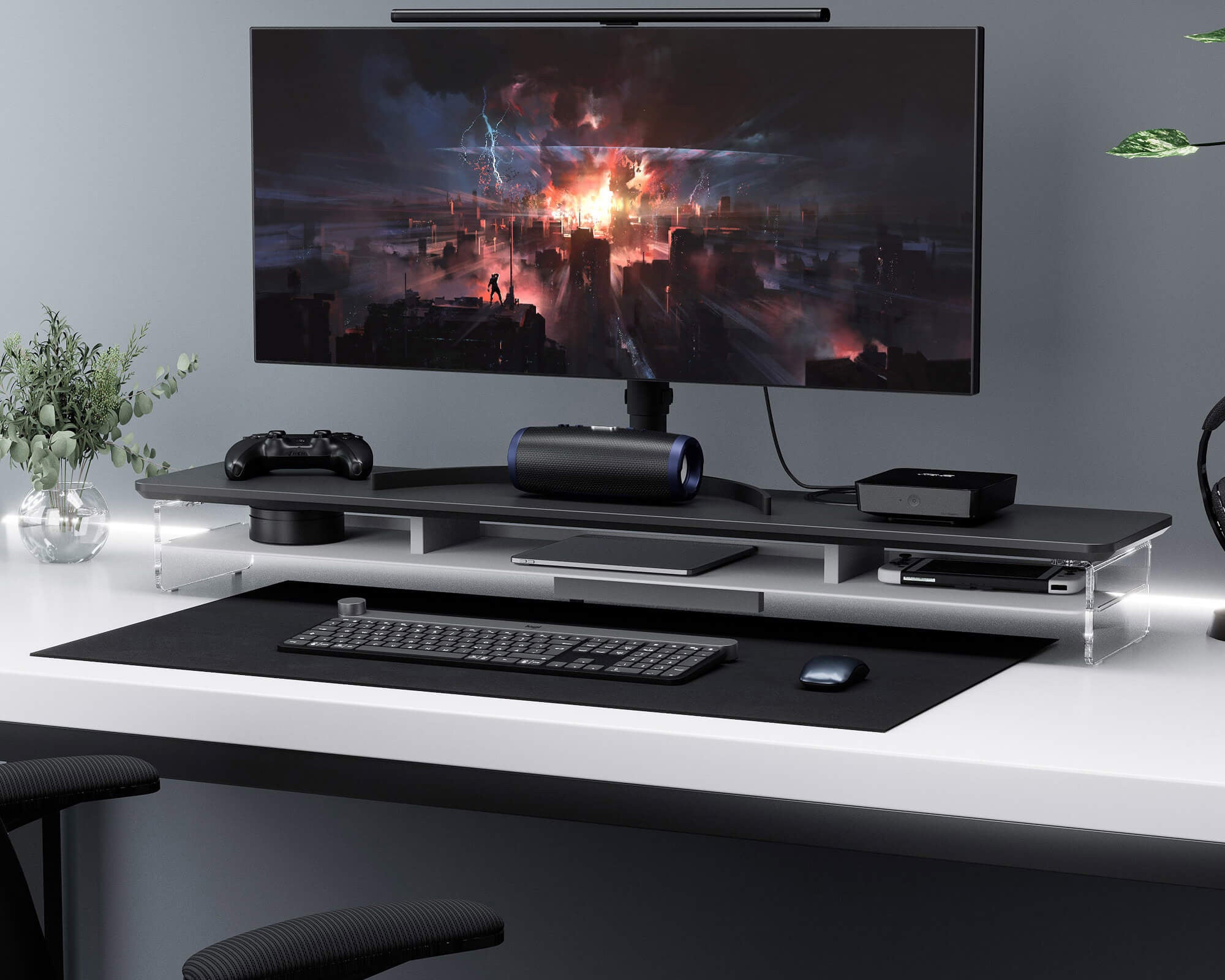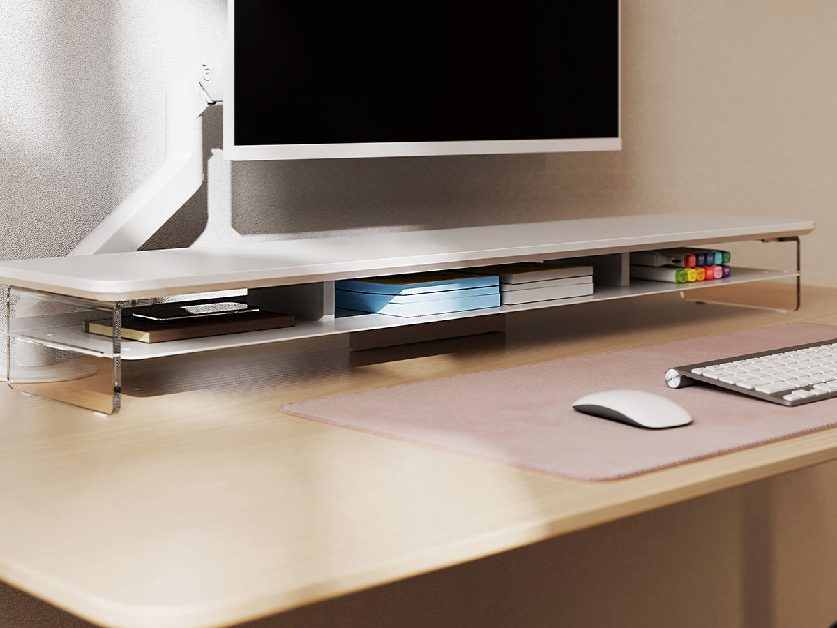 Clear acrylic with rounded edges and anti-slip pads provides sturdy support for up to 99 lbs of devices and essentials.